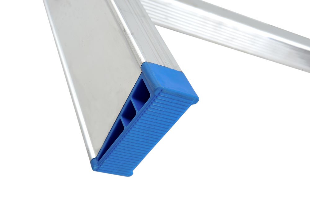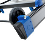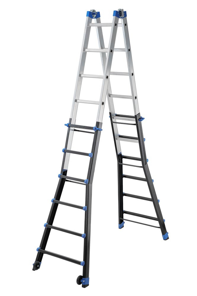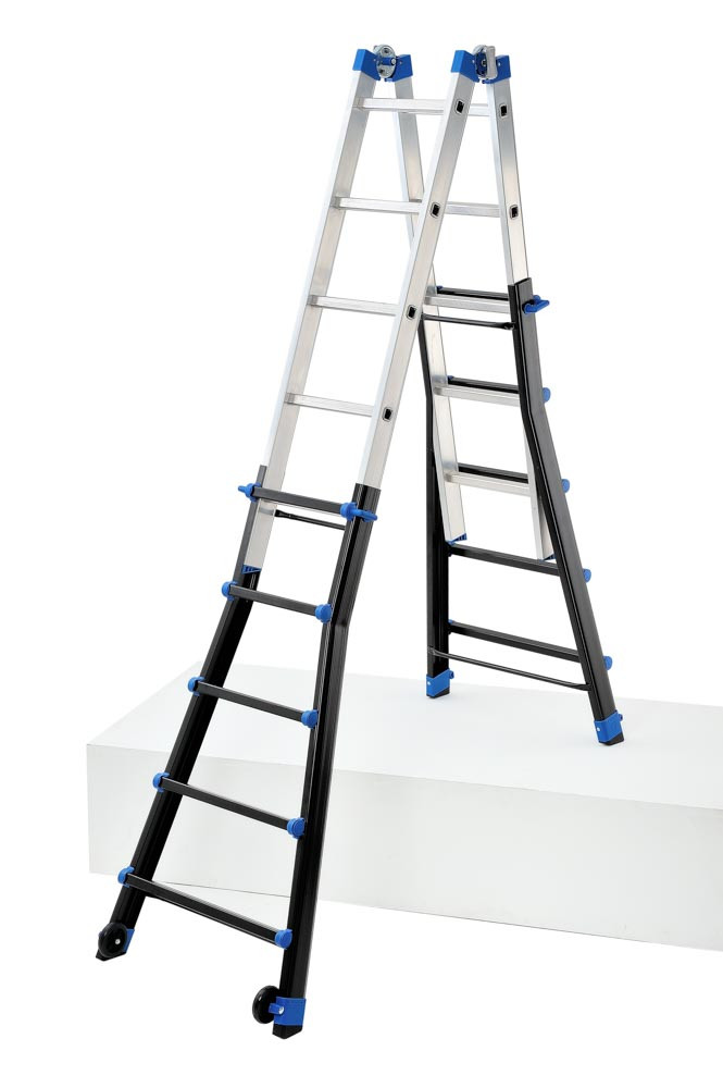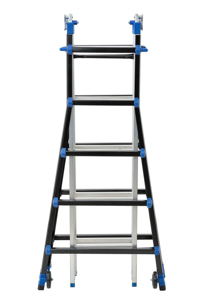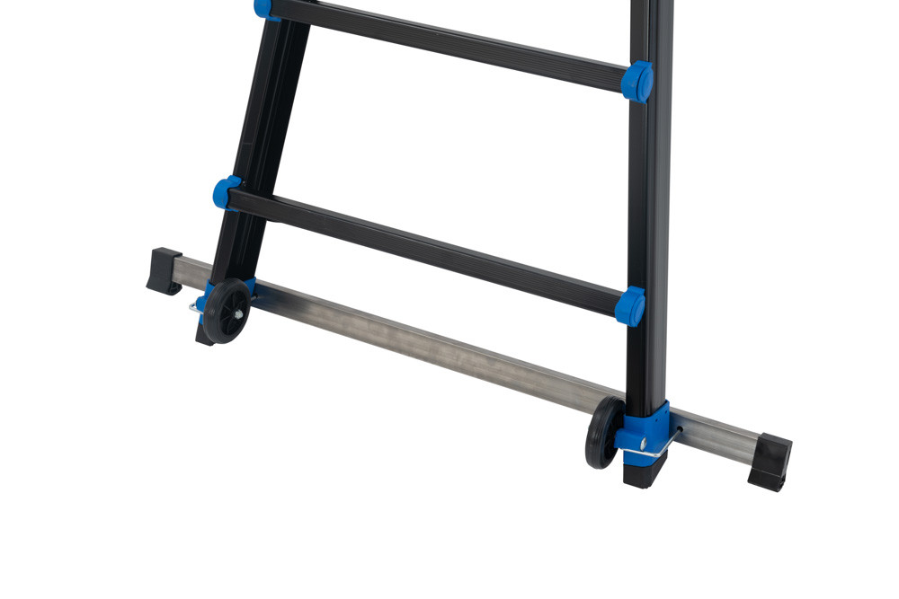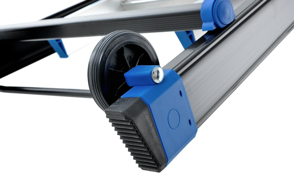 Les pieds extérieurs sont bi-composants, et tous les modèles de cette série professionnelle sont équipés de roues pour faciliter le transport de l'échelle.