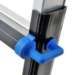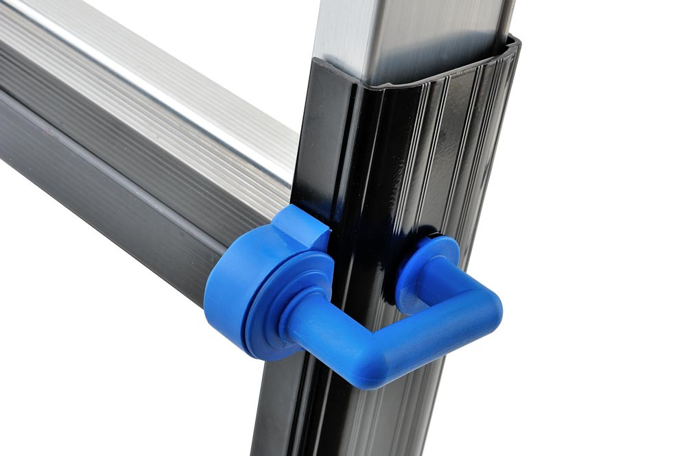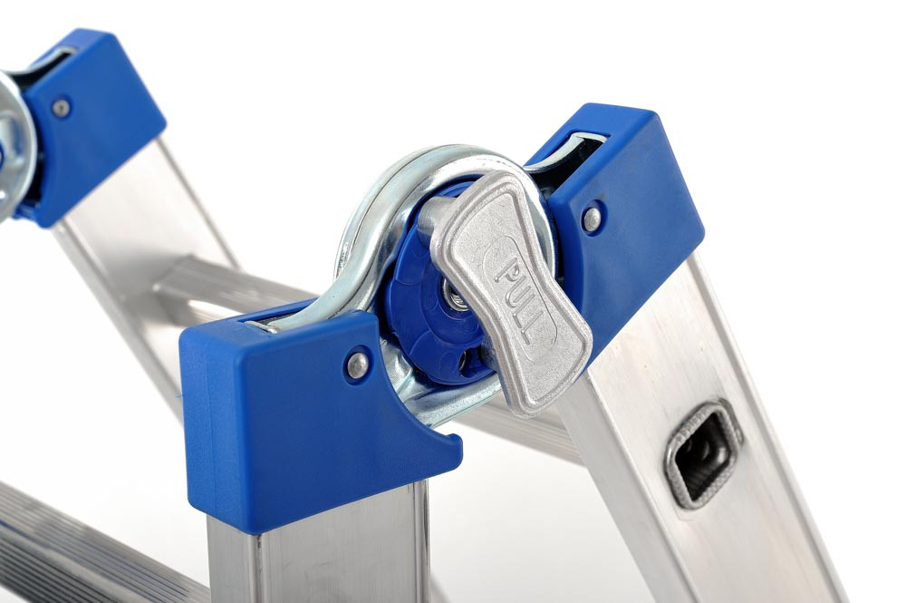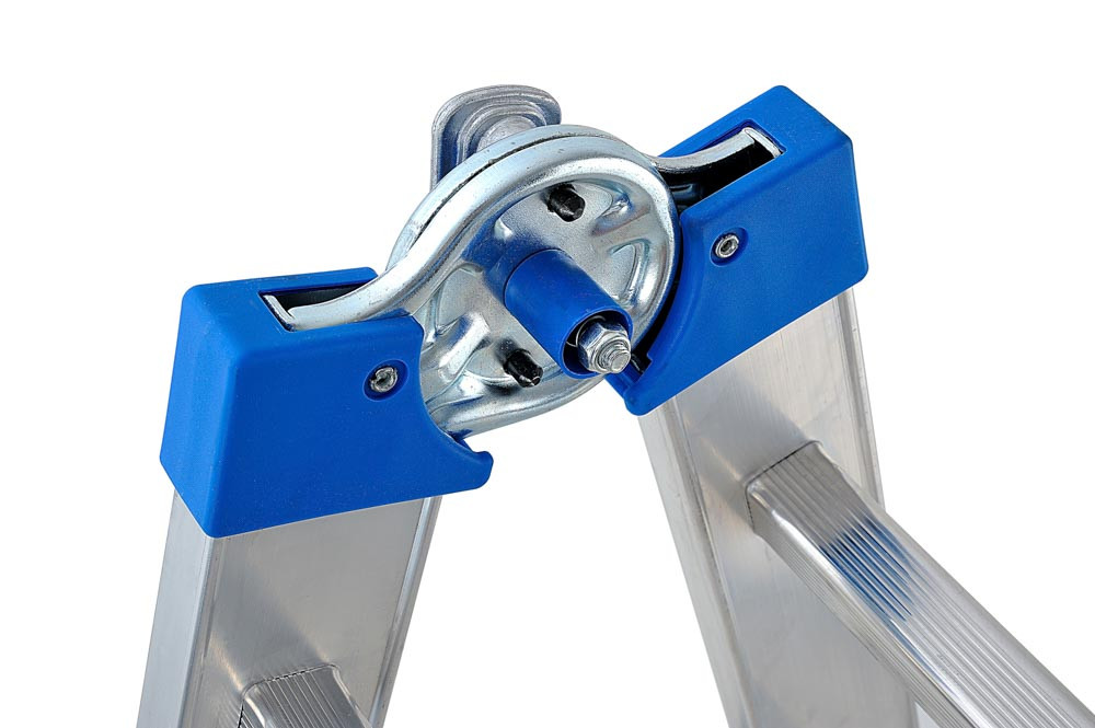 Cette échelle est un condensé de technologie, avec une articulation en acier dotée d'un système de sécurité d'ouverture-fermeture semi-automatique breveté, permettant de passer d'une configuration à l'autre facilement et sans erreurs. La poignée en aluminium, comme toute l'échelle, est ergonomique, ultra-résistante et facile à utiliser.