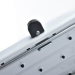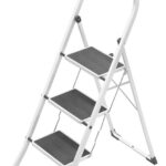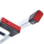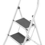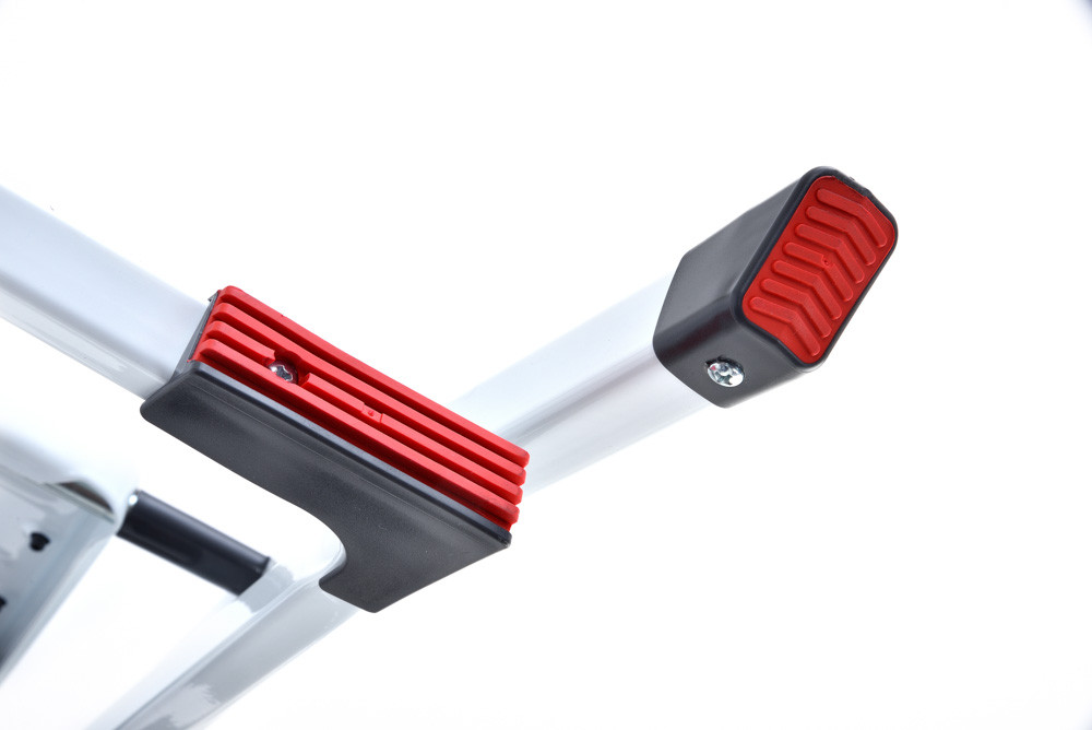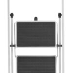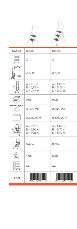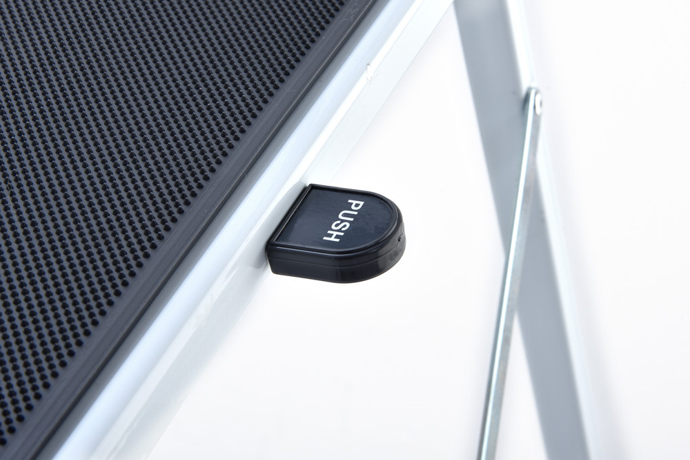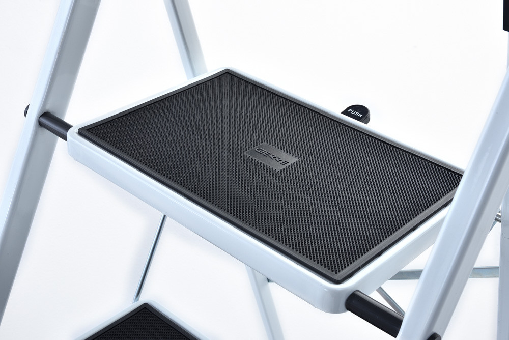 Sgabello con gradini, struttura in acciaio, con base d'appoggio a terra a corpo unico.